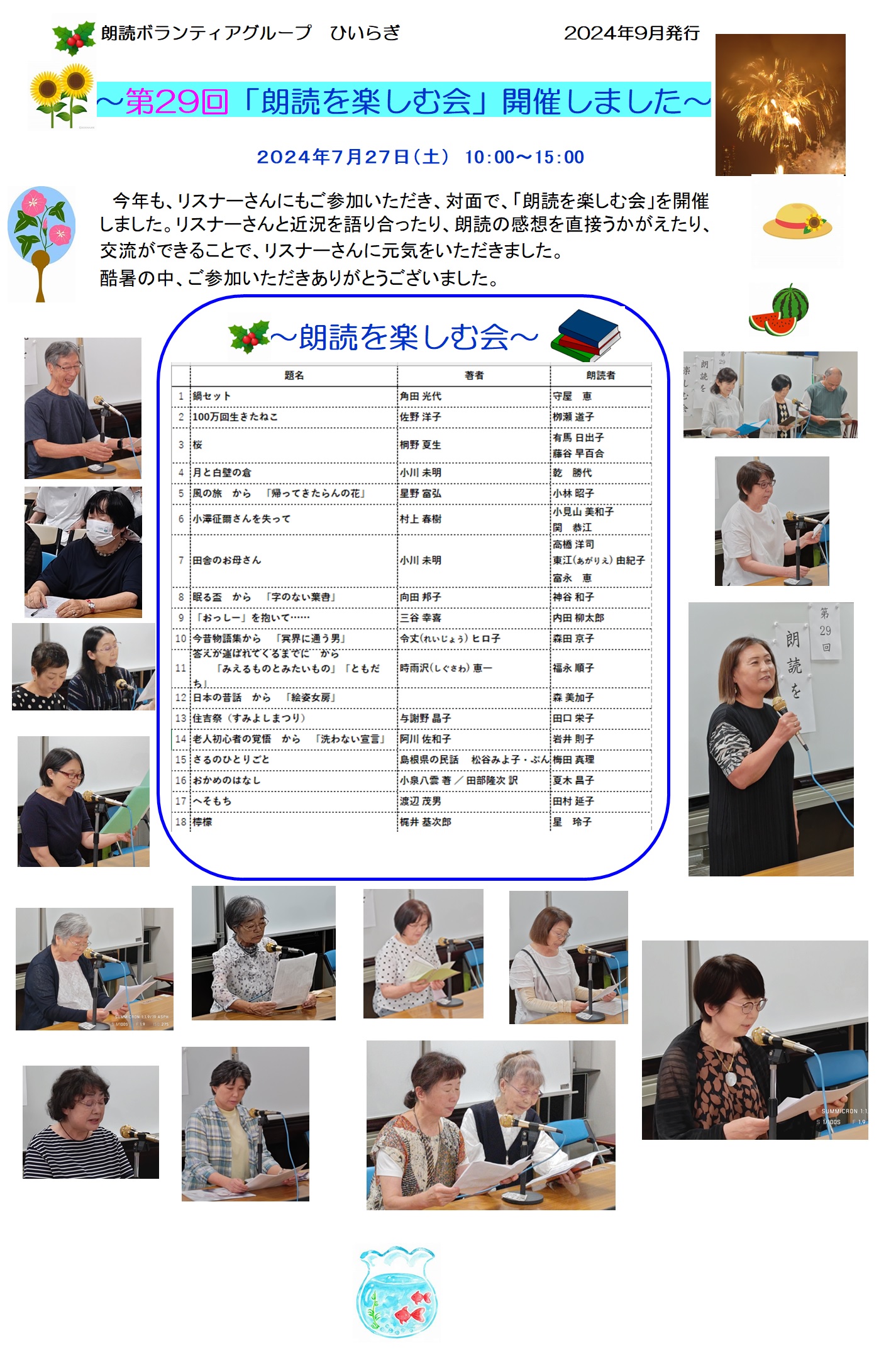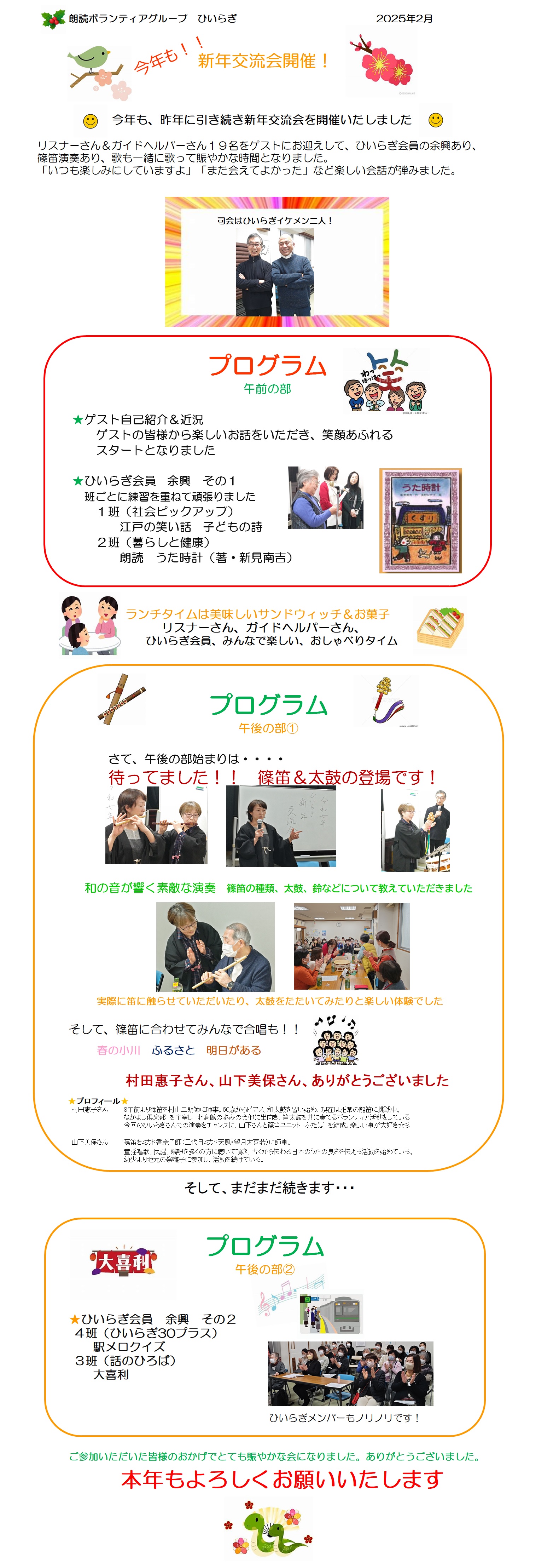 2024年後活動予定 2024年朗読を楽しむ会 ◇活動紹介 2023年度活動紹介→ 2023年度活動予定 2023年朗読を楽しむ会 2024年1月新年交流会 2022年度活動紹介 → 2022年活動自粛のお知らせ 2022年度活動予定 2021年度活動紹介 → 2021年度活動再開のお知らせ 2021年度活動予定 新年ご挨拶 2020年度活動紹介 → 2020年活動再開 神奈川県社会福祉協議会会長顕彰受賞 2019年度活動紹介 → 朗読を楽しむ会 ひいらぎ設立30周年 2020年新年に寄せて 2018年度活動紹介 → 1 2 2017年度活動紹介 → 1 2 3 |