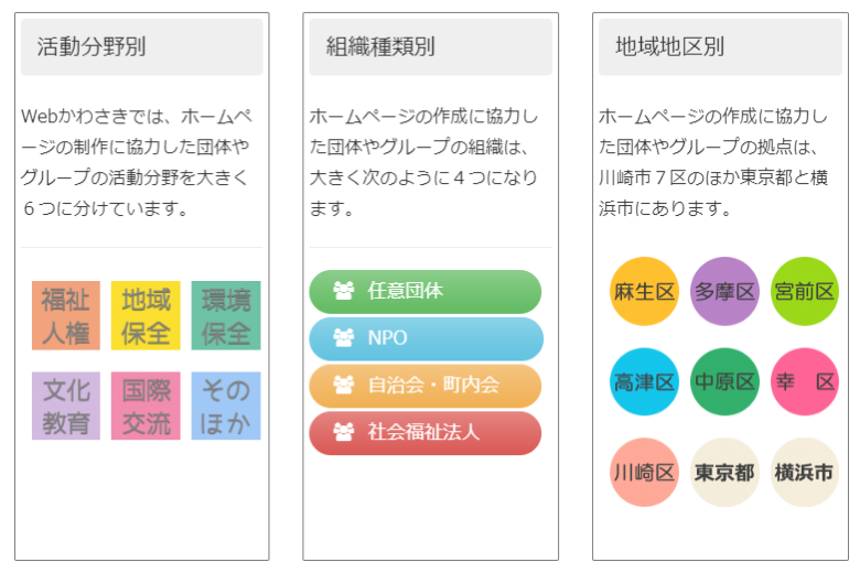 「Webかわさき」は川崎市および近隣の地域を活動拠点としているNPO、市民団体、ボランティアグループがインターネットを利用してその活動を広報する際のお手伝いをしています。