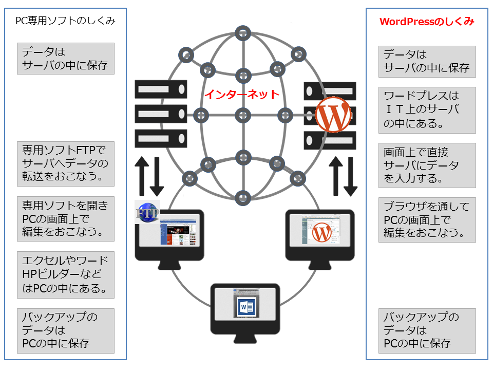 • HTMLなどの専門知識がなくても、記事更新が比較的容易にできるCMS(Content Management System)という「コンテンツを作るときに画像などを一括管理できるシステム」のWordPressを使用