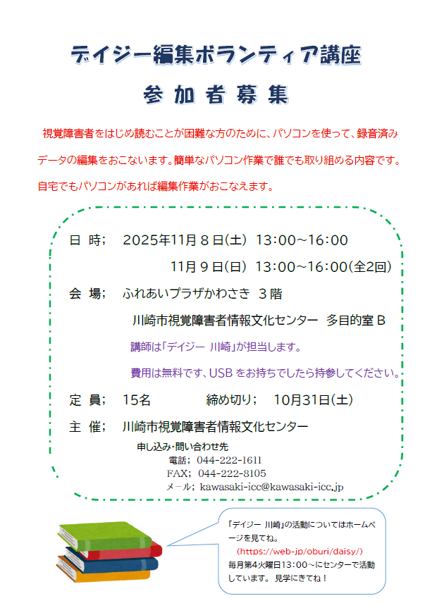 視覚障害者をはじめ読むことが困難な方のため、 パソコンを使って録音図書の編集をします。 少しでも興味の¥ある方、本の好きな方、 お待ちしています。 気になることがありましたらお問い合わせください。 2025年11月8日、9日、二日にわたり「デイジー編集ボランティア講座」を行いました。8名の方が参加してくださいました。参加された方々には、今後のご活躍を期待しています。 |